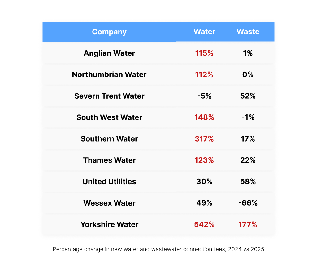 Meanwhile, connection fees are surging. Between 2024 and 2025, Yorkshire Water’s rose 542%. Southern Water: 317%. Anglian: 115%. Water isn’t a fixed cost anymore – it’s a variable one, and it’s moving in one direction.