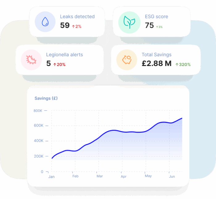 Detailed analytics on water usage and risk management, including Legionella risk levels.