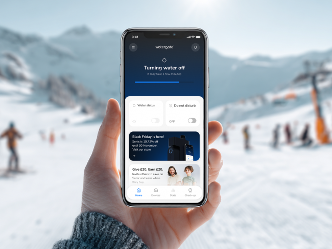 Watergate Sonic detects micro-leaks and shuts off mains water instantly if a pipe bursts.